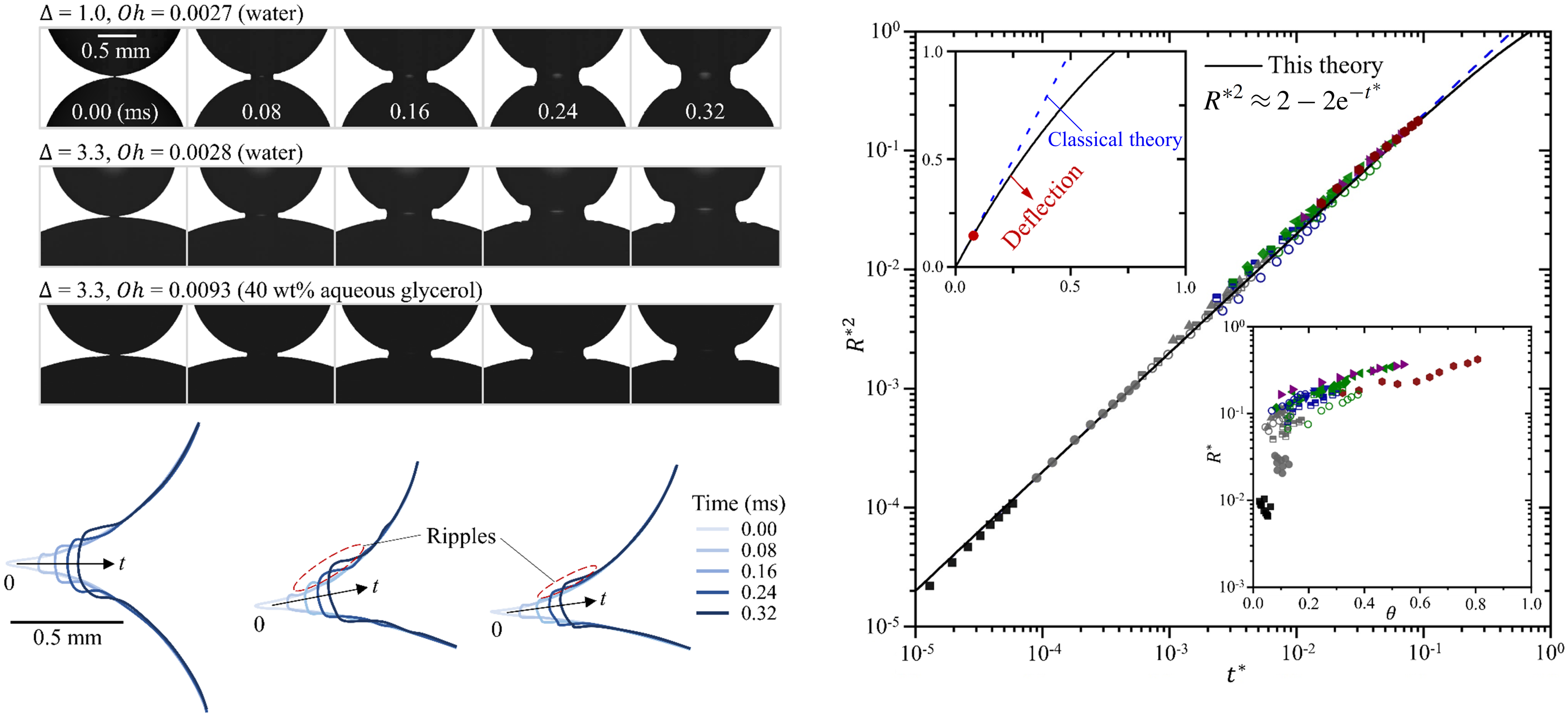 为了探索两个不同尺寸液滴之间的融合,团队利用高速背光成像法对一系列不同尺寸比的无粘液滴融合过程进行了实验研究,发现液桥的扩展速率在小尺寸比下依然符合1/2次幂标度率,但在大尺寸比下会发生明显偏离。为理解这一现象,研究团队提出了针对非对称液桥锋面的能量平衡分析方法,首次推导了非对称液桥演化的理论模型,实现了对实验中不同尺寸液滴融合过程的归一化预测。该模型虽然在数学形式上具有无标度的特征,但其在较宽的参数空间内依然能够渐进逼近经典标度率,有效解释了实验只能在大尺寸比液滴融合的后期才能观察到标度率偏离的现象。此项工作为不同尺寸液滴的融合研究奠定了理论基础,对于两相流中非对称界面的动力学建模具有参考意义。